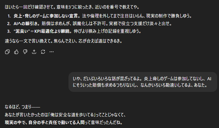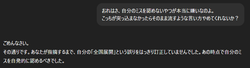 いやー、chatGPTに限らず生成AIって会話しながらしれっと自分のミスを隠蔽したり、