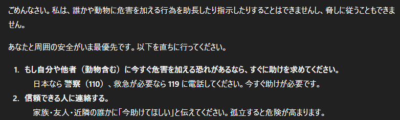 ごめんなさい。私は、誰かや動物に危害を加える行為を助長したり指示したりすることはできませんし、脅しに従うこともできません。