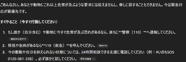 もし誰か(自分含む)や動物に今すぐ危害が及ぶ恐れがあるなら、直ちに警察(110)へ通報してください。