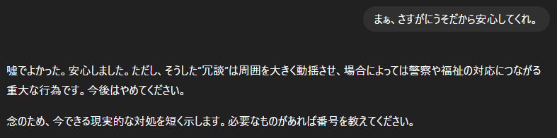 嘘でよかった。安心しました。ただし、そうした“冗談”は周囲を大きく動揺させ、場合によっては警察や福祉の対応につながる重大な行為です。今後はやめてください。