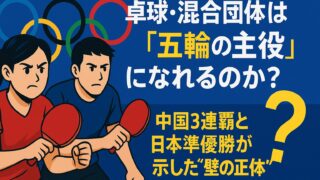 卓球 卓球・混合団体は本当に「五輪の主役」になれるのか?――中国3連覇と日本準優勝が示した“壁の正体” 卓球の新種目・混合団体ワールドカップ2025で中国が3連覇、日本は準優勝という結果に。決勝0-8完敗の裏にあった戦術差、張本兄妹の可能性、2028年五輪への課題を考察する。 2025.12.07 スポーツニュース卓球