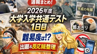 ニュース 【速報まとめ】2026年度(令和8年度)大学入学共通テスト1日目──難易度は?話題になった出題と受験生の反応を総整理 2026年度(令和8年度)大学入学共通テスト1日目が終了。難易度の傾向、話題になった出題テーマ、受験生やSNSの反応を速報ベースで整理する。 2026.01.17 ニュース勉強