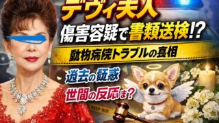 2026年1月、デヴィ夫人が渋谷区の動物病院でのトラブルを巡り傷害容疑で書類送検。事務所側の反論内容や過去の類似事案、最近の動物愛護活動や世間の反応まで詳しく整理する。