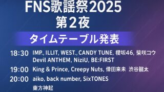 テレビ FNS歌謡祭2025 第2夜 タイムテーブル発表 2025年12月10日放送のFNS歌謡祭第2夜の公式タイムテーブル、出演者、歌唱曲、企画内容、放送時間を事実のみで整理。 2025.12.10 テレビニュースメディア芸能界音楽