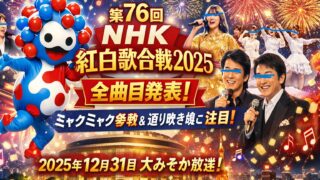 ニュース 【全曲目発表】第76回NHK紅白歌合戦2025、ミャクミャク参戦で大みそかが異変する 第76回NHK紅白歌合戦2025の最新情報を整理。全曲目発表の内容、ミャクミャクとのコラボ、返り咲き組や特別企画、ゲスト審査員まで事実ベースで詳しくまとめる。 2025.12.19 アイドルテレビニュース考察芸能界音楽