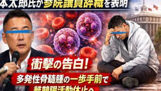 ニュース 【衝撃の決断】山本太郎氏が参院議員辞職を表明-多発性骨髄腫の一歩手前診断…「命を守るための選択」と無期限活動休止へ- れいわ新選組代表・山本太郎氏が健康上の理由で参院議員辞職と無期限活動休止を表明。多発性骨髄腫の一歩手前と診断された病状の詳細、記者会見の発言、党運営への影響、今後の政治活動の見通しを整理して解説します。 2026.01.21 ニュース政治