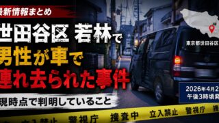 ニュース 世田谷・若林で男性が車で連れ去られた事件の全体像|現時点でわかっている事実と未解明点 2026年4月28日に世田谷区若林で発生した男性連れ去り事件について、発生状況、警察の対応、現時点で判明している情報と未解明点を整理。ネット上の反応や推測される背景も含めて解説。 2026.04.29 ニュース事件考察